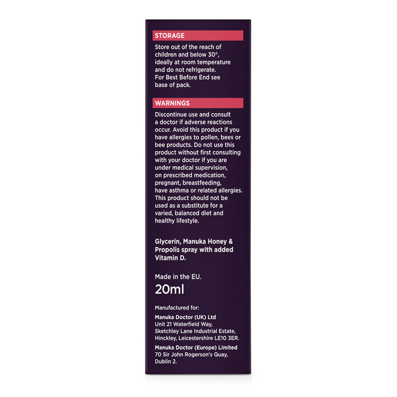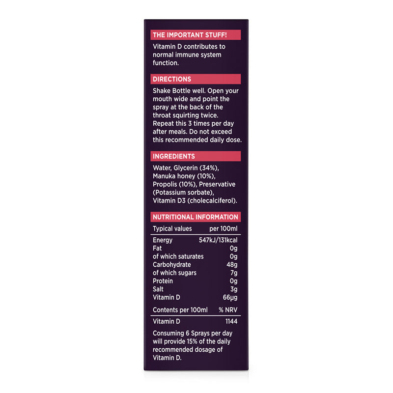 Wasser, Glycerin (34%), Manuka Honig(10%), Propolis (10%), Preservative (Potassium sorbate), Vitamin D3 (cholecalciferol).