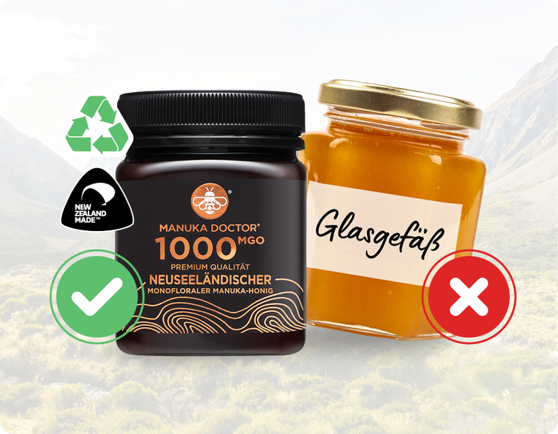 Daher sind Marken die ihren Manuka in Europa in günstige Gläser abfüllen, um dann horrende Preise dafür zu verlangen mit Vorsicht zu genießen.